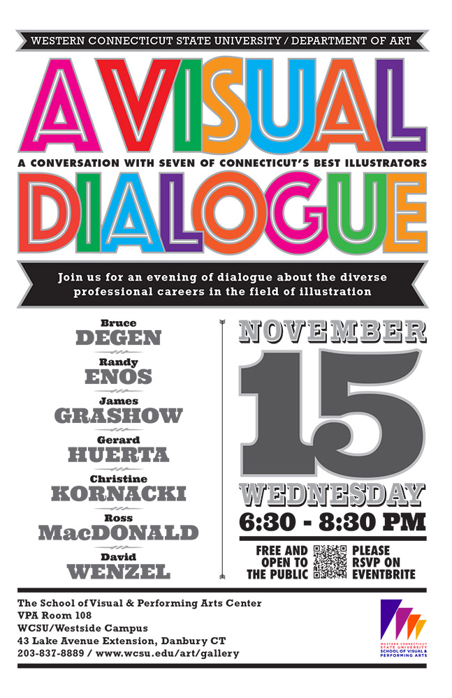 The panel will be held in conjunction with the current exhibition at the VPAC Art Gallery, “Thinking Visually: The Art of Connecticut Illustrators,” which presents works by 15 local illustrators spanning a wide spectrum from popular children’s book illustrations, magazine covers, cardboard constructions and stamp designs to graphic images for cartoons, albums, advertising, video games, films, and television series.