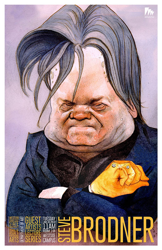 Steve Brodner is an illustrator, caricaturist and political commentator working for publications in the U.S. since the 1970’s. He received his BFA from Cooper Union in 1976 and began his long career as a freelance illustrator with the New York Times Book Review in 1977. The list of magazines and newspapers to which he has contributed sly commentary on controversial subjects and political events includes: Harper’s, National Lampoon, Rolling Stone, Spy, Esquire, The New Yorker, The Nation, Village Voice, The Washington Post, LA Times, and many more.