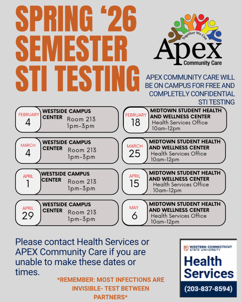 APEX Community Care is a short walk from the Midtown Campus- you can also schedule an appointment directly with them. Click Here for a link to their website or call them (203)778-2437