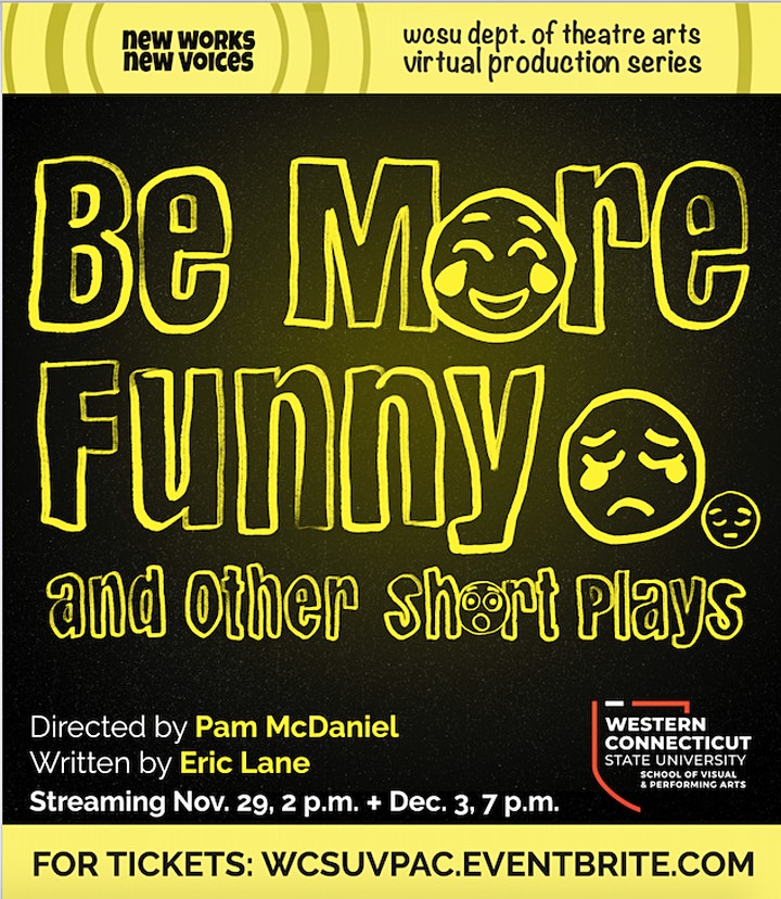 Virtual eventThe WCSU Department of Theatre Arts will present “Be More Funny and Other Short Plays” as part of the virtual series, New Works – New Voices. From comic to dramatic, this collection of award-winning short plays spans a wide range …