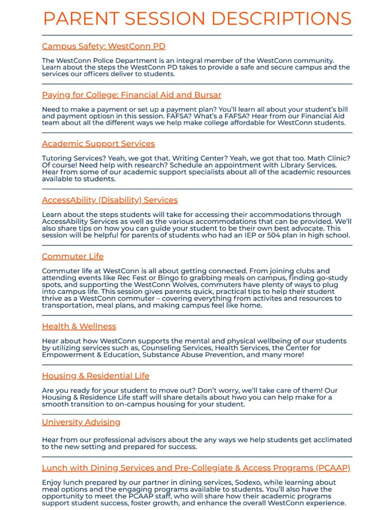 As your student begins their transition to college at WestConn, we know that this will be a period of transition for parents as well. During orientation you will have a chance to learn more about the WestConn community and all of the supports we have in place for your student to be successful! At WestConn, we take pride in a campus that supports students and fosters their growth as they develop academically, professionally and socially. We invite you to be part of university life here, too. And now, as a parent of a WestConn student, you will have the opportunity to do just that. Our goal is to keep parents updated and informed on events taking place at the university.