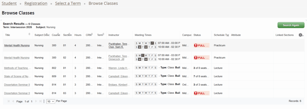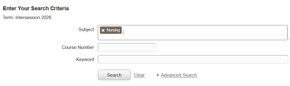 Clicking on “Search” without entering any specific search criteria will provide a list of all classes for the selected term.