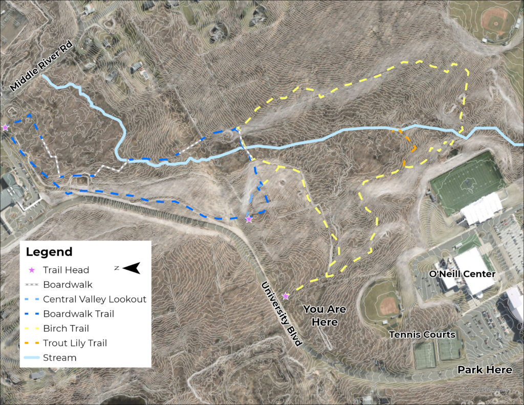 Here are some directions if it is your first time visiting the preserve: Drive down University Boulevard, past the tennis courts on the right, as far as the maintenance building on the left. Park on either side of the road, uphill of the “No Parking” signs. Walk down the road to the new section of University Boulevard and bear right. Walk on the right side of the guard rail (i.e., off the road); go up the hill along the guard rail. To your right you will see a sign and kiosk at the entrance to the WNP and its two trails.